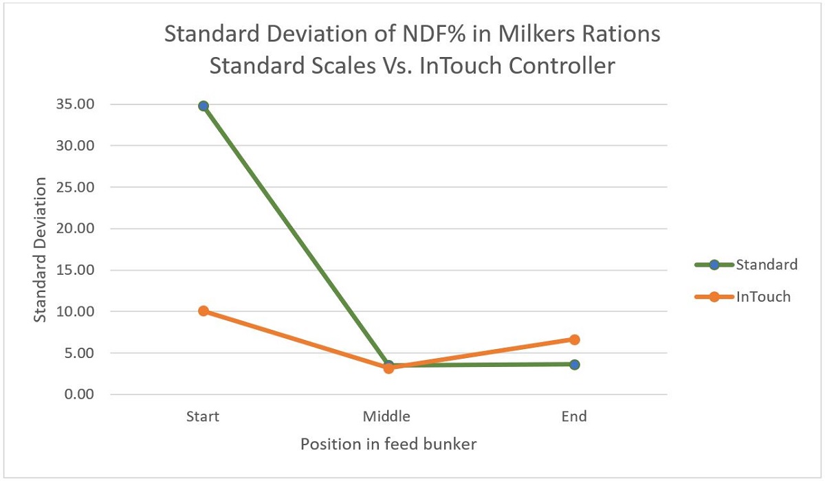 Laboratory analysis on rations formed using standard mixer scales versus InTouch controller systems found further inconsistencies. Standard scales showed a 33% variance in NDF dry matter content, whilst the InTouch controller showed only 17%.